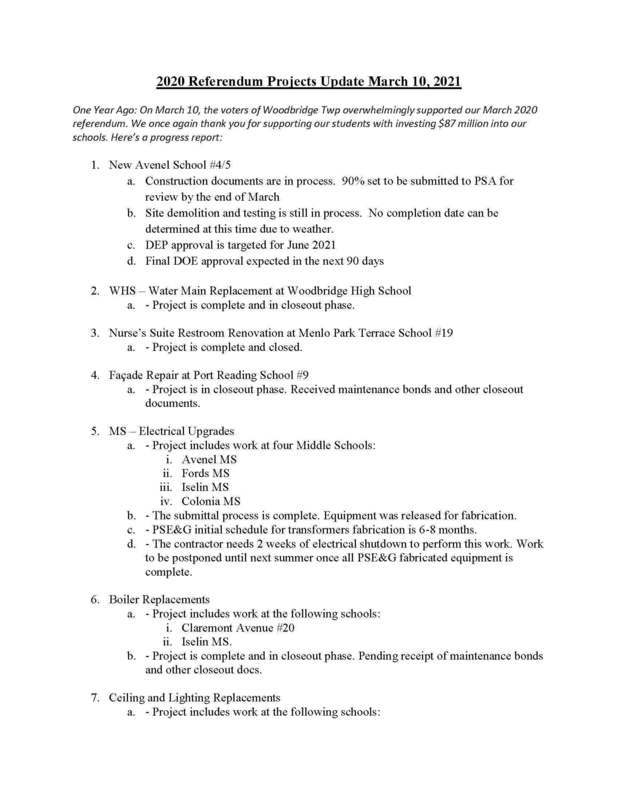 One Year Ago: On March 10, the voters of Woodbridge Twp overwhelmingly supported our March 2020 referendum. We once again thank you for supporting our students with investing $87 million into our schools. Here’s a progress report. Photos of completed projects may be viewed on our district webpage under the Board of Education section scroll down to Referendum Updates or by clicking this link: https://www.woodbridge.k12.nj.us/o/wtsd/browse/196988