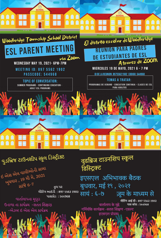 Join us for the ESL Parent Meeting on Wednesday, May 19, 2021 from 6 PM - 7 PM.