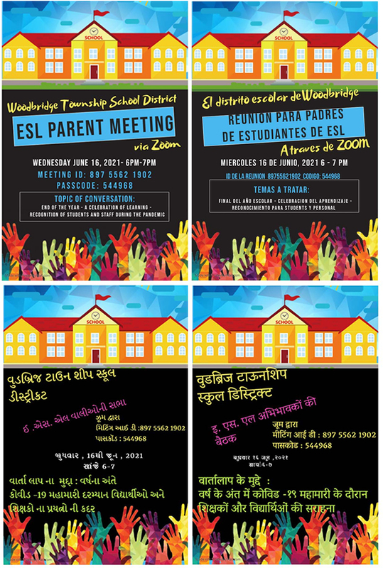 Join us for the ESL Parent Meeting on Wednesday, June 16, 2021 from 6 PM - 7 PM.