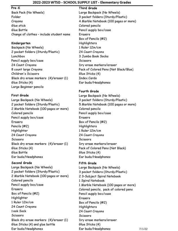 The WTSD 2022-2023 School Supply List for Elementary Students https://5il.co/1dyrz