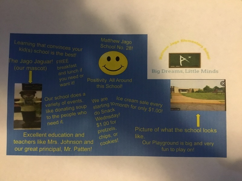 The attached projected was completed by the Matthew Jago School fourth and fifth grade Gifted and Talented Enrichment Students. The project publicizes the highlights of attending Matthew Jago School.