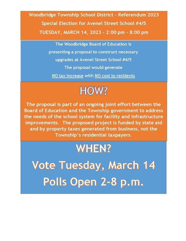 A Special Election will take place on March 14, from 2:00 p.m. – 8:00 p.m., asking Woodbridge residents to take a public vote to approve a proposal from the school district to make significant renovations at School 4 & 5 (Avenel Elementary School) on Avenel Street. The proposed renovations would generate NO tax increase with NO cost to residents.